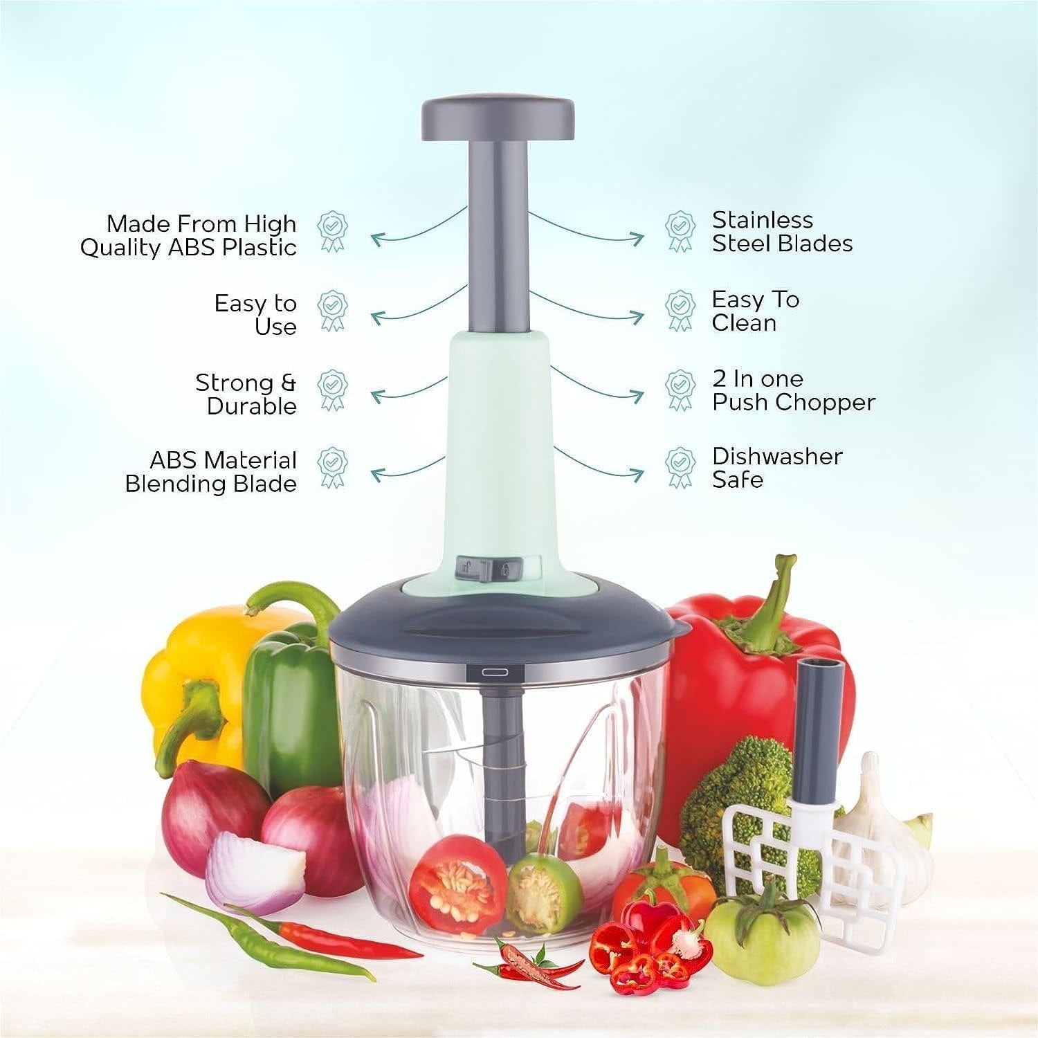 Whether you're preparing salads, stir-fries, or sauces, this chopper delivers perfectly uniform pieces in seconds. Just load the container, push the handle, and watch the sharp stainless steel blades do their magic!